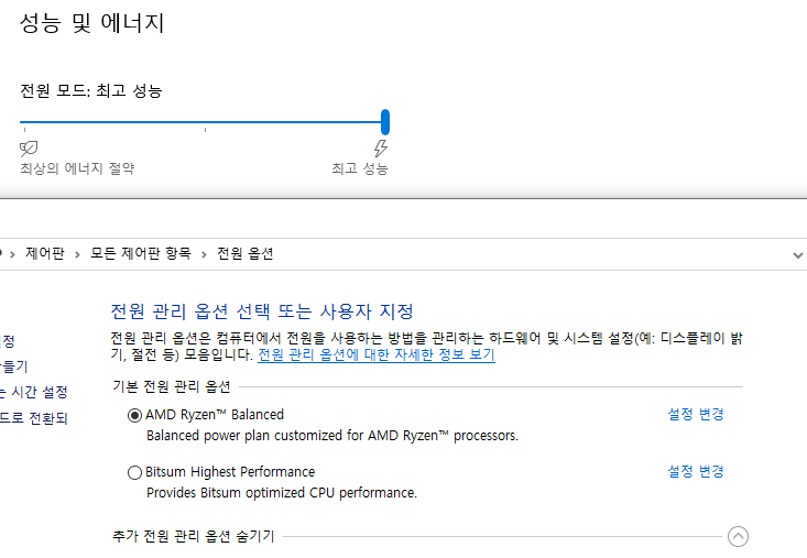 ParkControl을 설치하면 전원 옵션에 Bitsum Highest Performace 라는 항목이 생긴다. 머 기존에도 전원옵션 건드리는 유틸은 많이 있었다. 삼성 SSD 관리툴인 Samsung Magician 구버전에서도 이런 기능이 있었고, 최근에는 AMD 칩셋드라이버를 깔면 이상한 러시아어로 된 옵션이 생긴다.