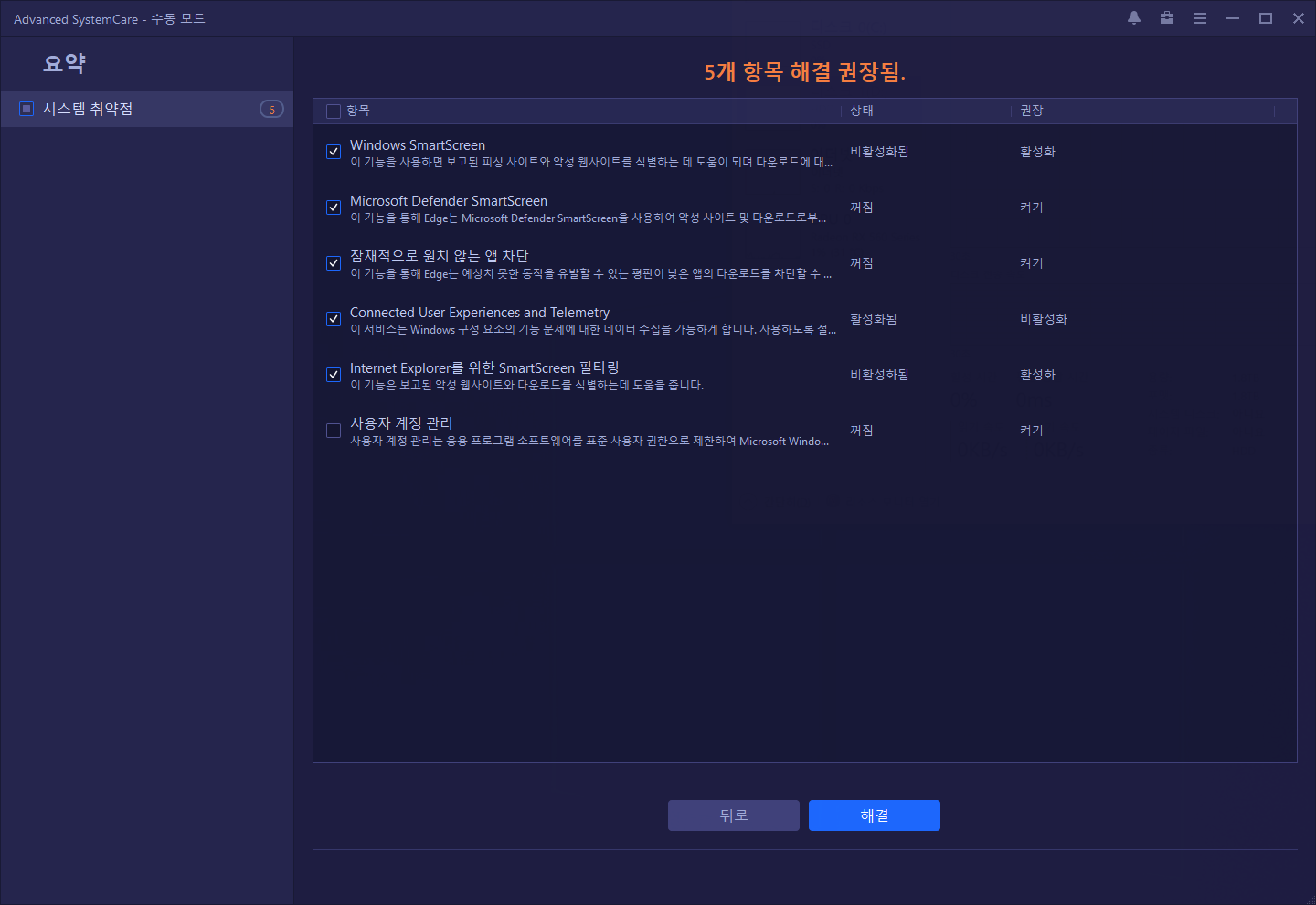프리버전은 5개가 나왔는데 이건 내가 SmartScreen을 꺼놔서 그렇다. 아까 위에서 순정 상태라고 하긴 했지만 윈도우의 스마트스크린 기능을 극혐하기 때문에 꺼놔서 그런 것이다. 윈도우 설치 후 당연히 꺼야 하는 사용자 계정 관리(UAC-사용자 계정 컨트롤)도 보안 강화하라고 진단에 잡혀 왔다. 근데 저거 키면 불편하잔어~