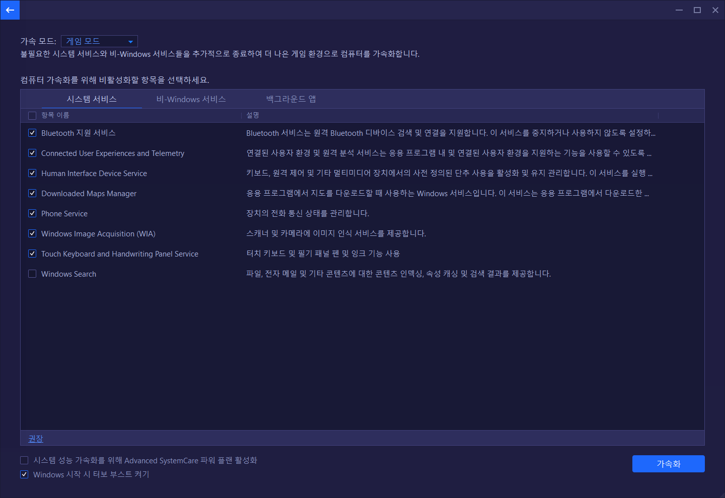 가속 모드에 게임,작업,절약모드 세 가지가 있는데 게임모드로 해서 색인(Search) 빼고 다 체크하고 가속화 눌러주면 된다. 끝.