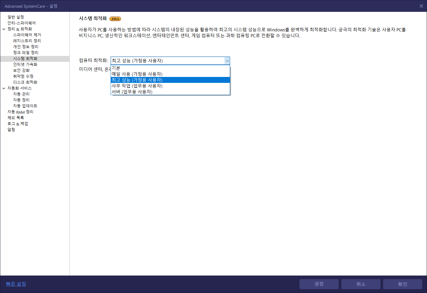 5.시스템 최적화에서는 프리는 기본만, 프로는 이하 4가지의 선택이 가능하다. 기본과 최고 성능 두 가지만 보도록 한다.