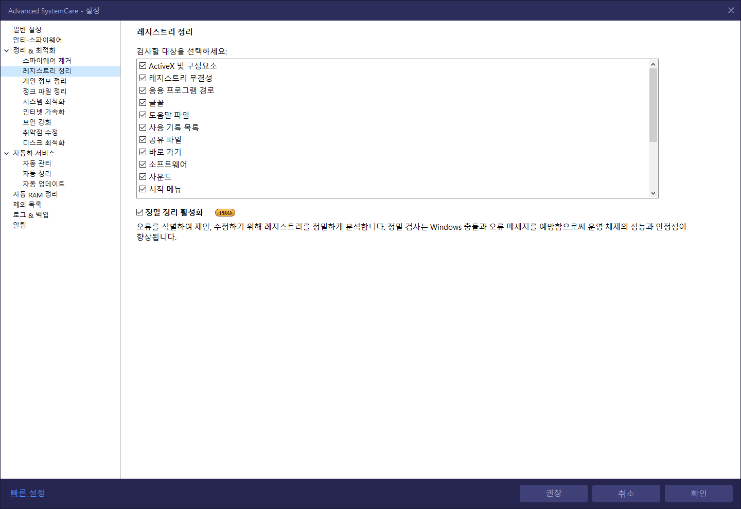 4.레지스트리 정리는 불필요한 레지스트리 항목을 삭제하여 시스템을 조금이나마 빠르게 해 줄 것이다. 프로버전에서는 정밀 정리 활성화 기능을 사용할 수 있다.