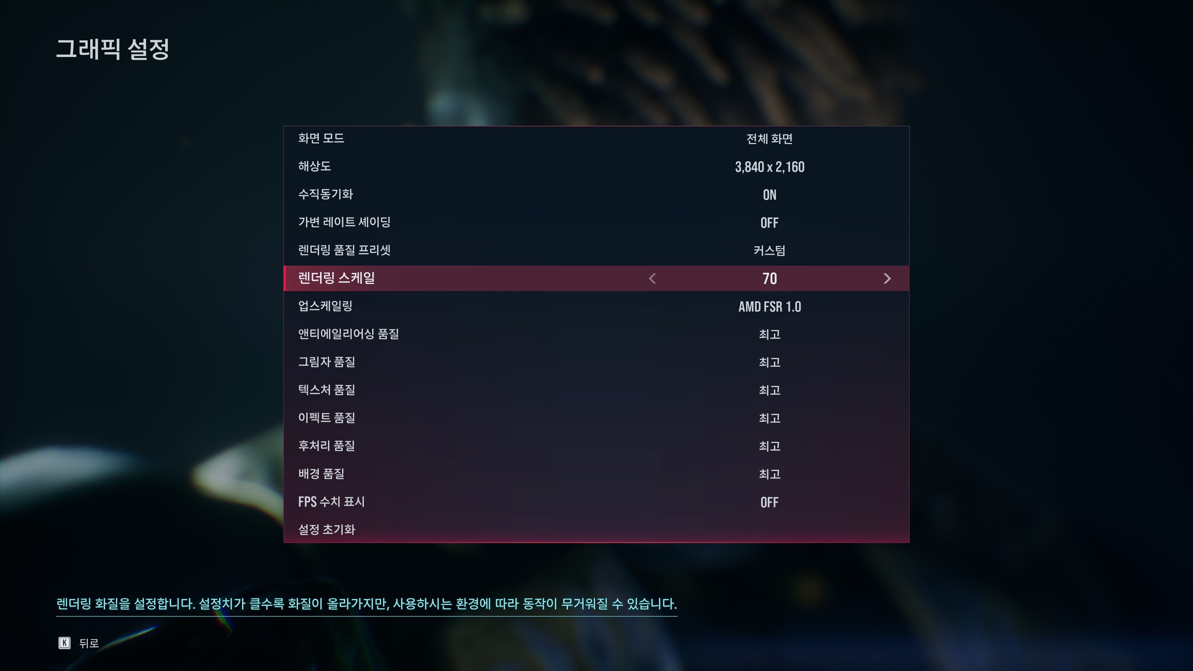 순서대로 렌더링 70 FSR(기본), DLSS QUALITY, 렌더링 85 최고옵
