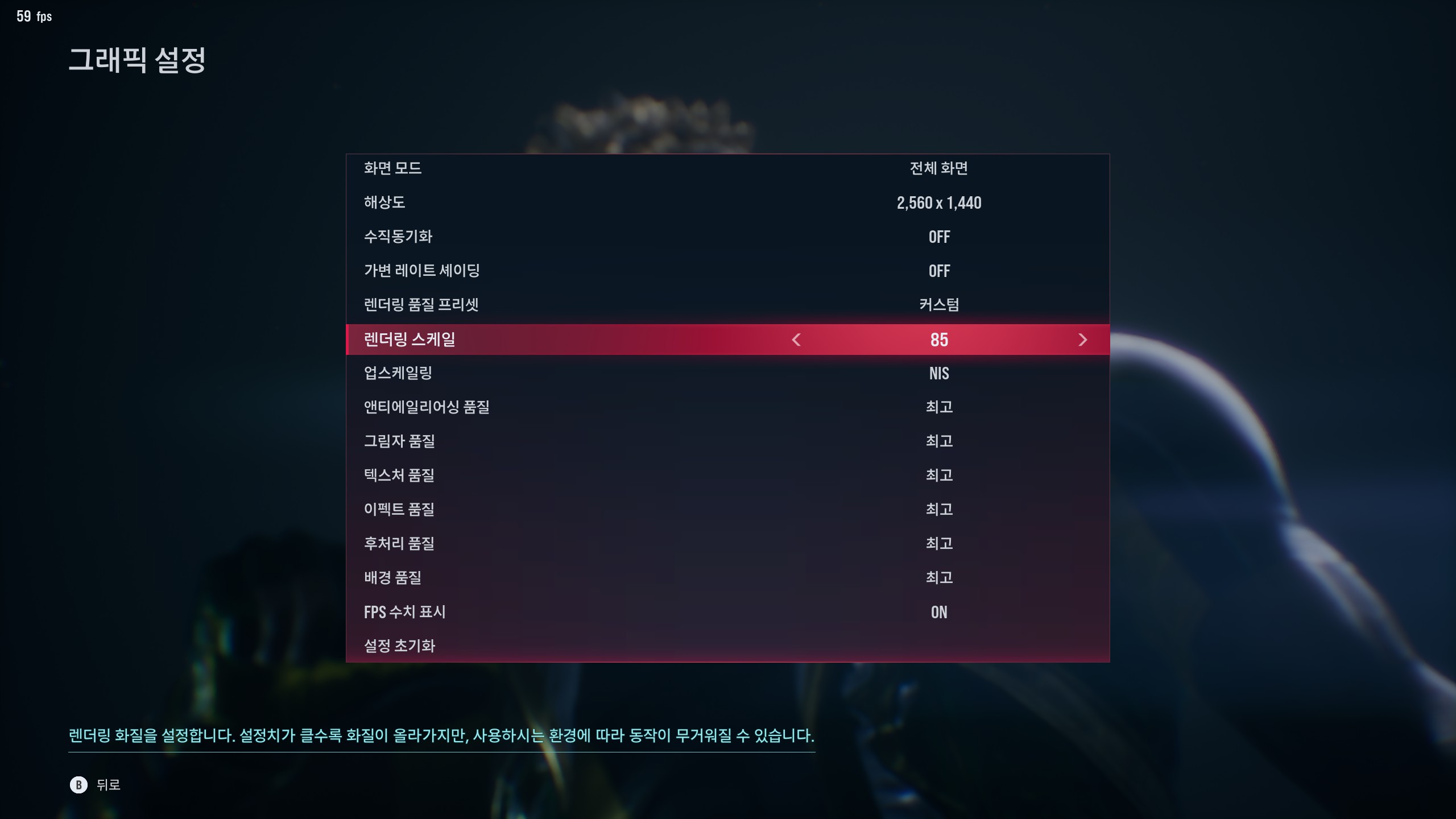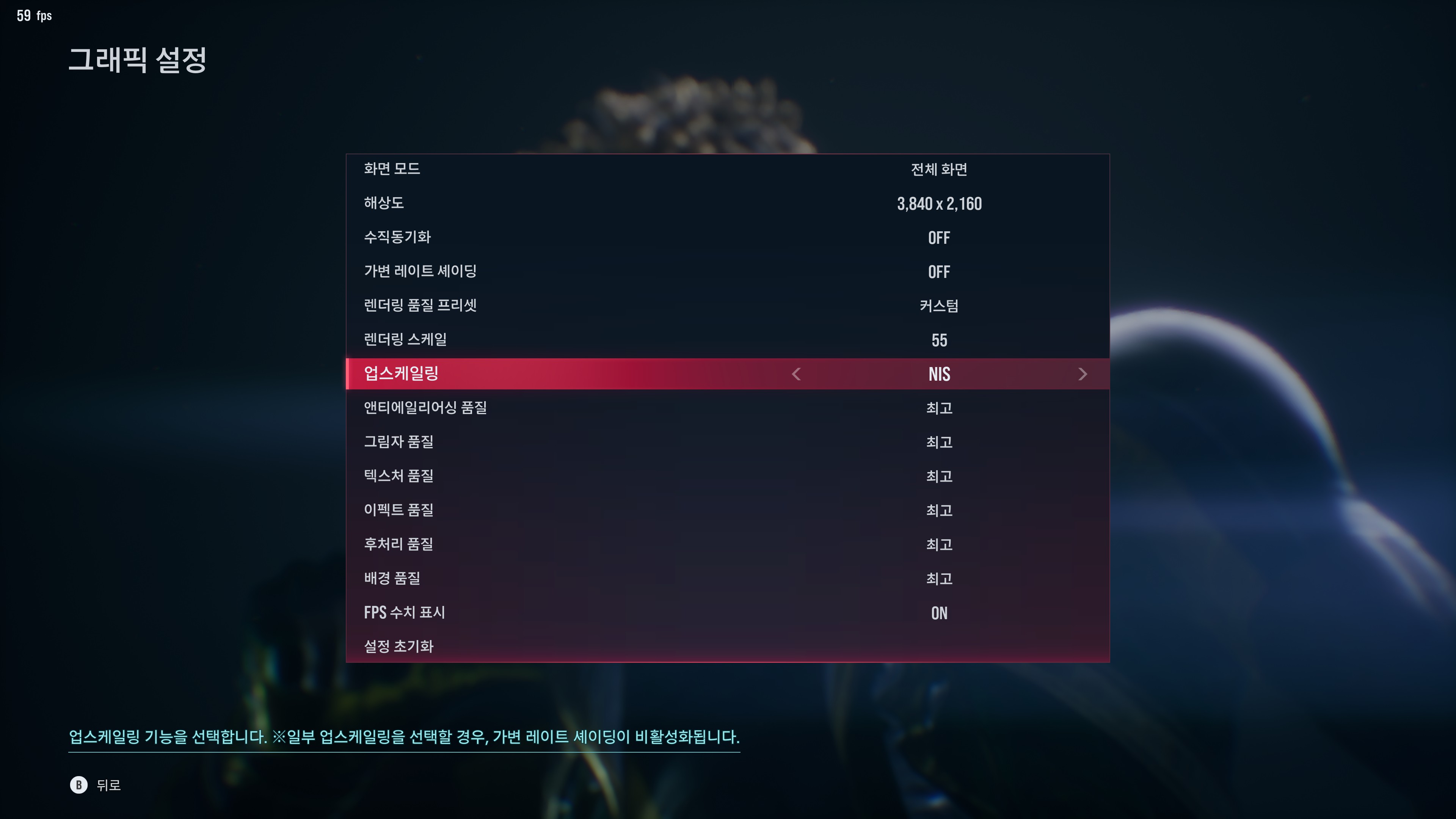 결국 렌더링 50인 DLSS 퍼포먼스와 NIS55 정도에서 타협해야 했다. DLSS퍼포먼스도 사실 엄청 간당간당해서 까딱하면 순간 1 프레임 떨어질지도 모르겠는데 테스트 중에 하락하는 경우는 없었지만 혹여 떨어지는 경우에는 옵션을 하나씩 낮춰보자.