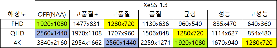 QHD XeSS 퍼포먼스 중옵, FHD XeSS 퍼포먼스에서 상옵 됨.