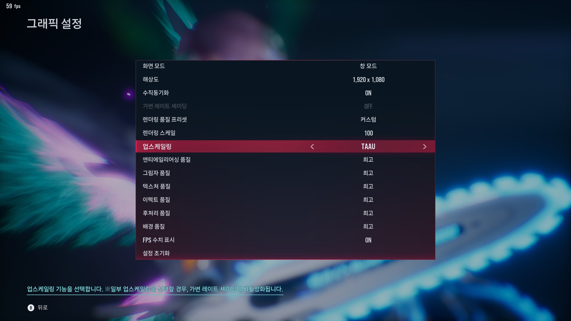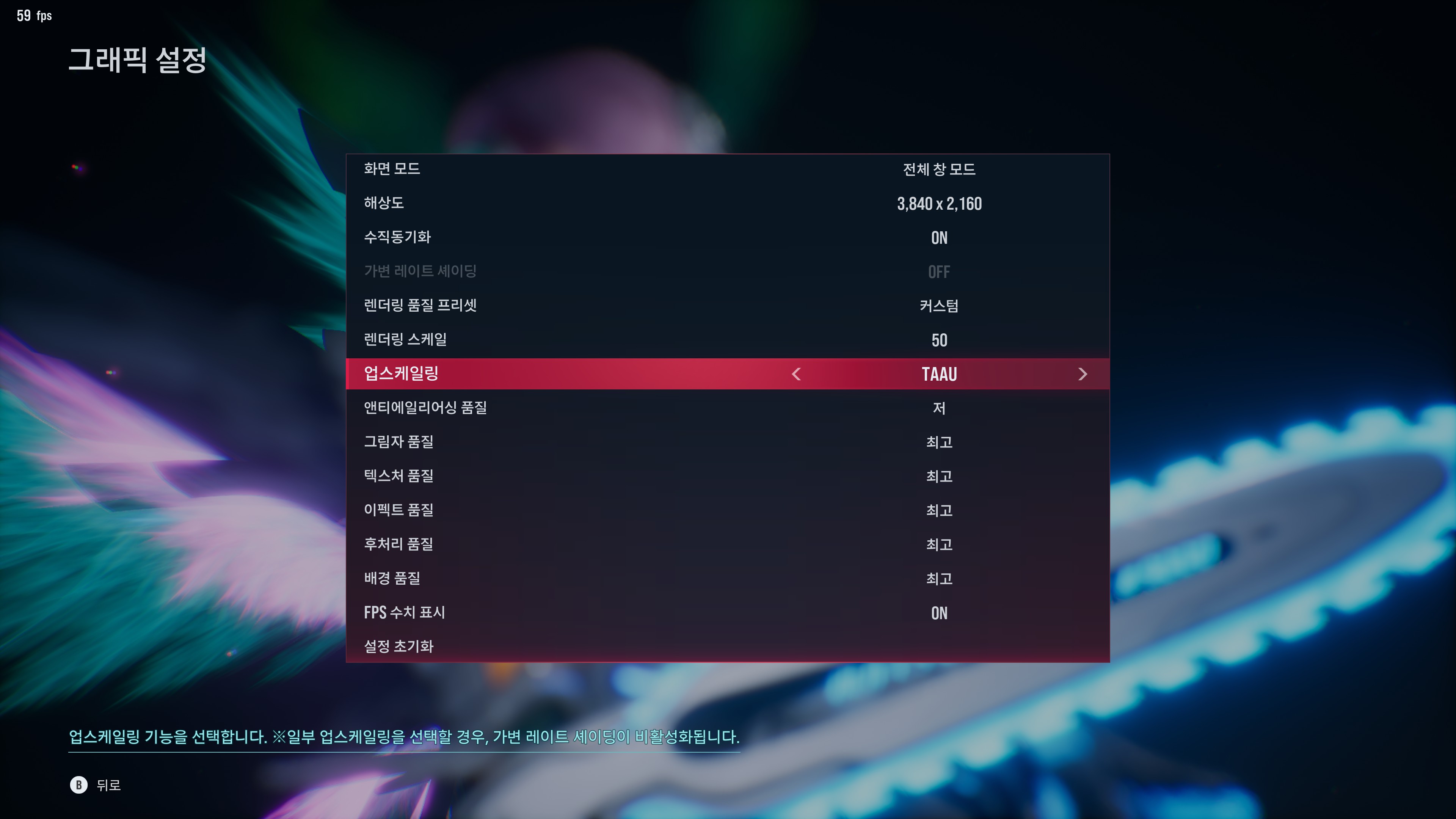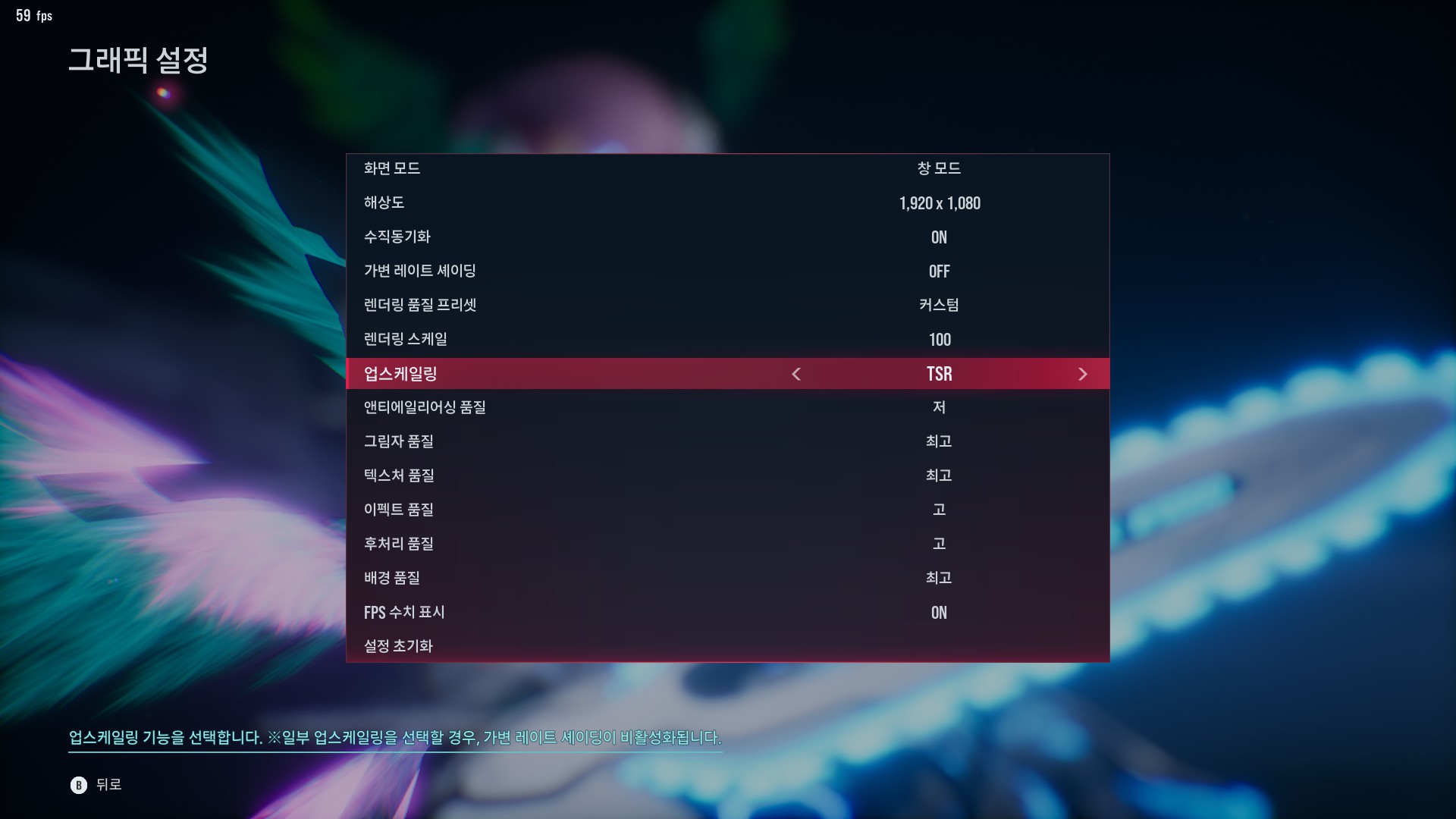 FHD 1920x1080에서는 대충 렌더링 100에 풀 옵션이 된다. TAAU에서는 아주 잘 되고 TSR에서도 얼추 잘 되는데 빡빡하다. 이상하게 안티를 켜면 점유율이 크게 상승하여 TSR 쓸 거면 끄는 것 추천. TAA 라던데 왜 이렇게 안티 영향을 받지..?