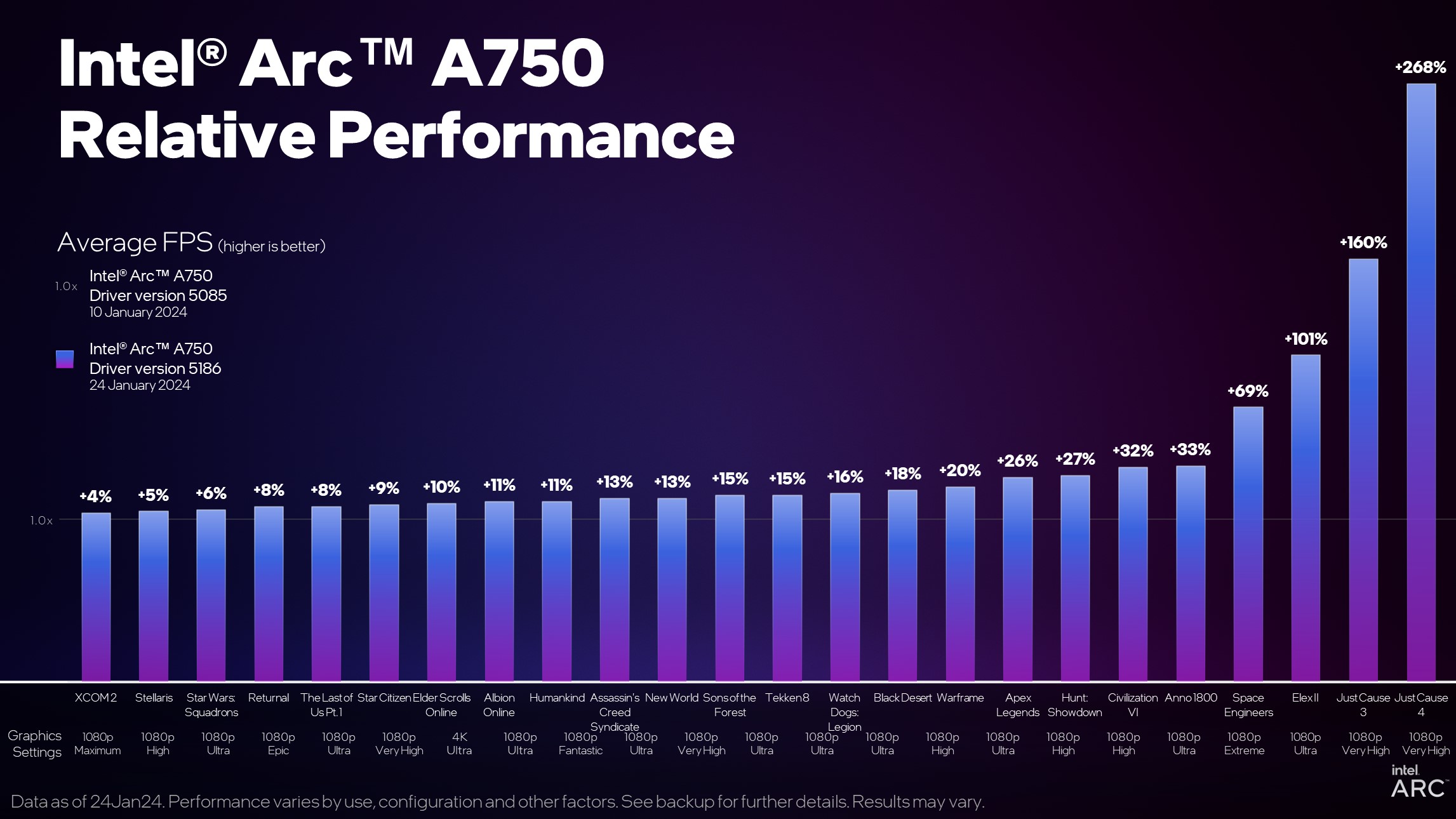 아크는 철권8 정식 출시 이틀 전 1월 24일에 5186 드라이버를 배포하며 4K에서 최대 15% 성능을 향상했다고 주장했다. (– Tekken 8 (DX12): Up to 15% average FPS uplift at 4K with Ultra settings)