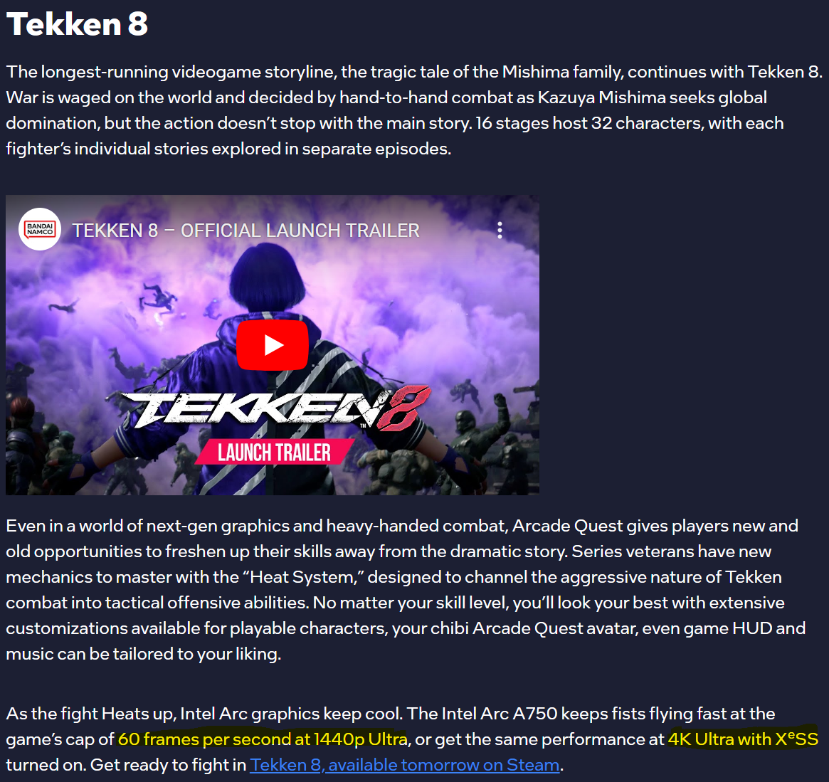 Tekken 8 - 1080p high , XeSS performance mode: 60 FPS