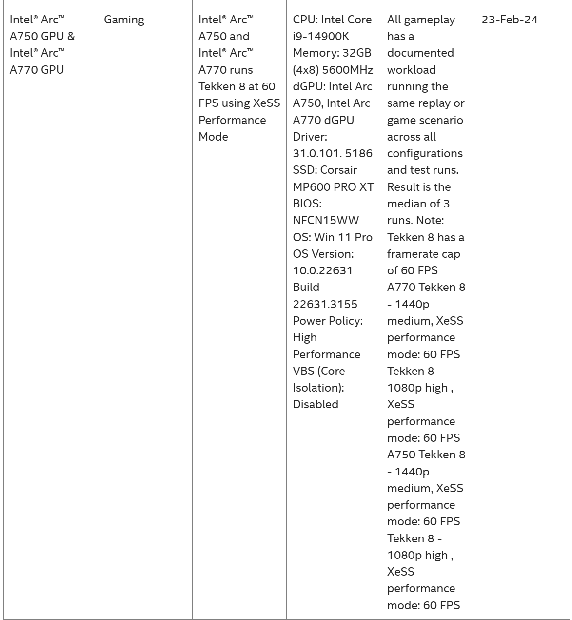 인텔은 공홈에 Performance Index라고 자기들이 테스트한 게임의 성능을 업로드해 놓는다. 그중에 철권 8도 있는데 2월 23일에 A750과 A770으로 테스트한 결과를 한번 보자. 이미지로는 보기 힘드니까 정리해서 다시 올려봄