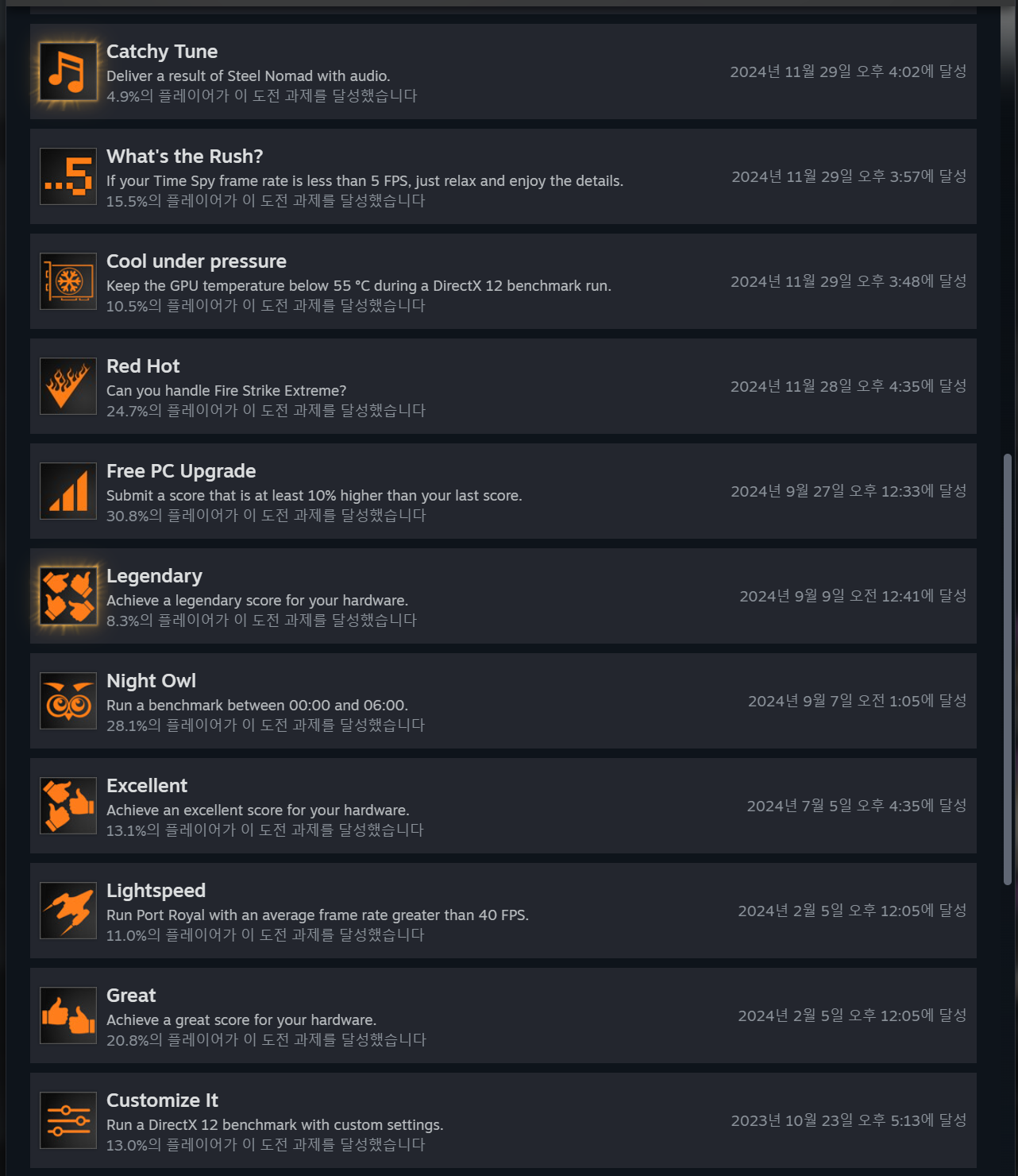 본론으로 돌아와서 3DMark 또한 스팀에 게임으로 등록되어 있다 보니 당연하게도 도전 과제가 있다.